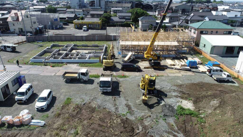 5月24日より西側の棟で、これまで行われていた基礎工事の上に、建物の骨組みとなる構造体を現場で組み上げる「建方(たてかた)という工程が始まりました。