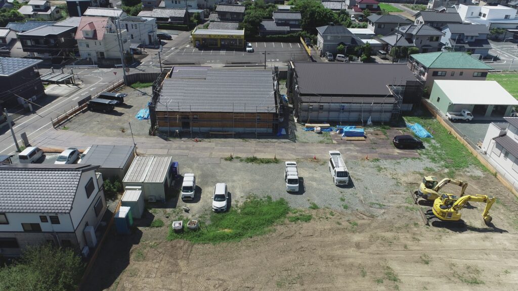 東棟は上棟のあと、屋根、壁面へと工事が進んでいます。西棟は、外壁も貼られ、外側は先月のニュースでお伝えしたデザインがわかるようになってきました。