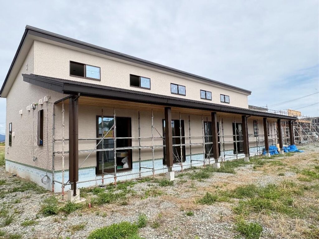 西棟では、建物の周りの足場が外され、建物の全容が見やすくなってきました。完成前に敷地全体を30センチの盛土をするため、建物の下の方30センチは、土の中になります。
